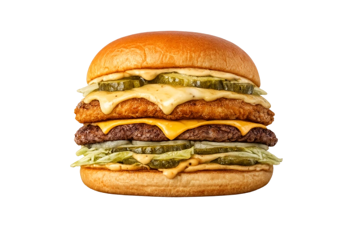 Le smash ultime avec quatre steaks frais smashés, cheddar fondant et garniture fraîche pour une expérience exceptionnelle.