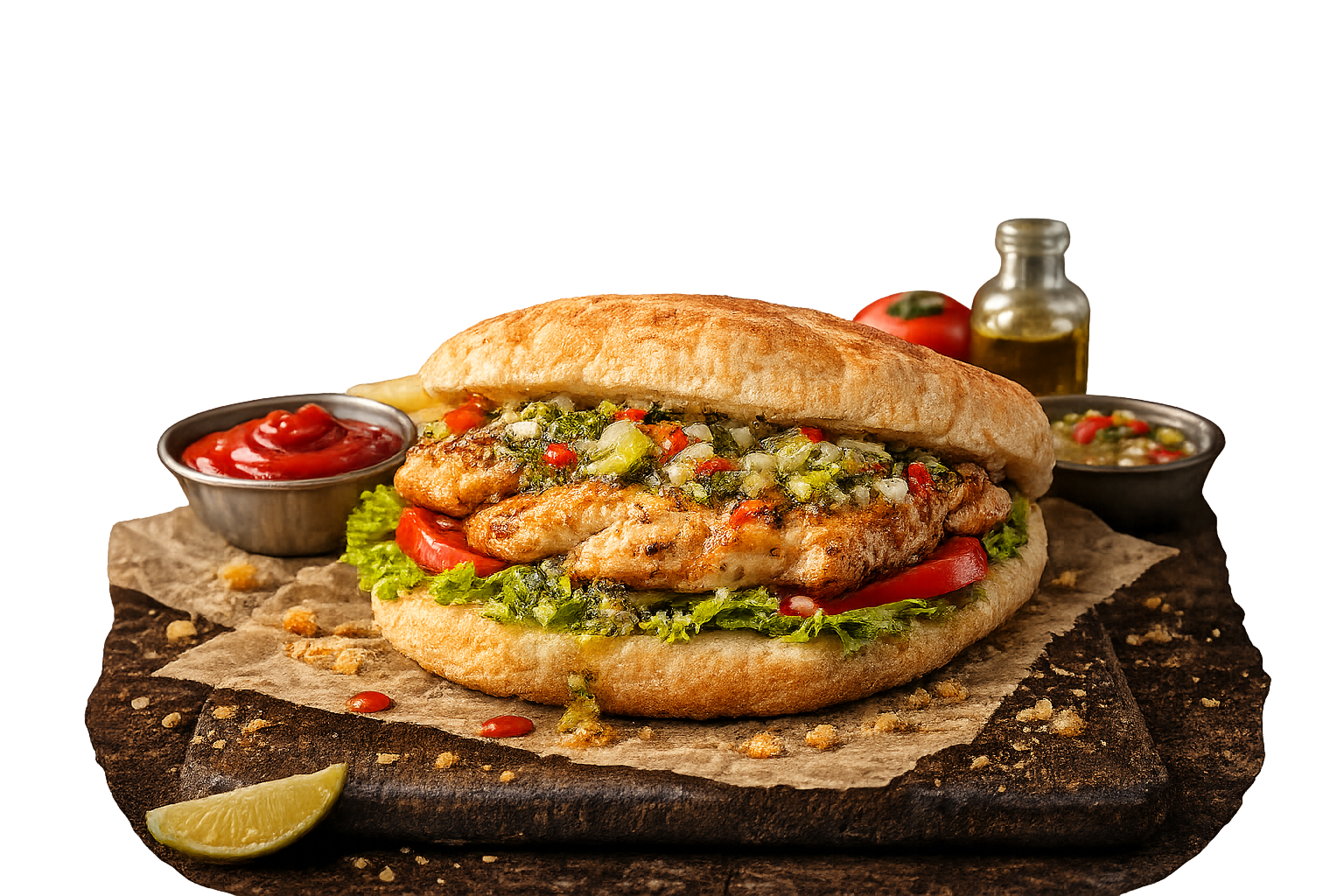 Un pain bokit moelleux et authentique, garni de viande savoureuse et relevé par la célèbre sauce chien antillaise.