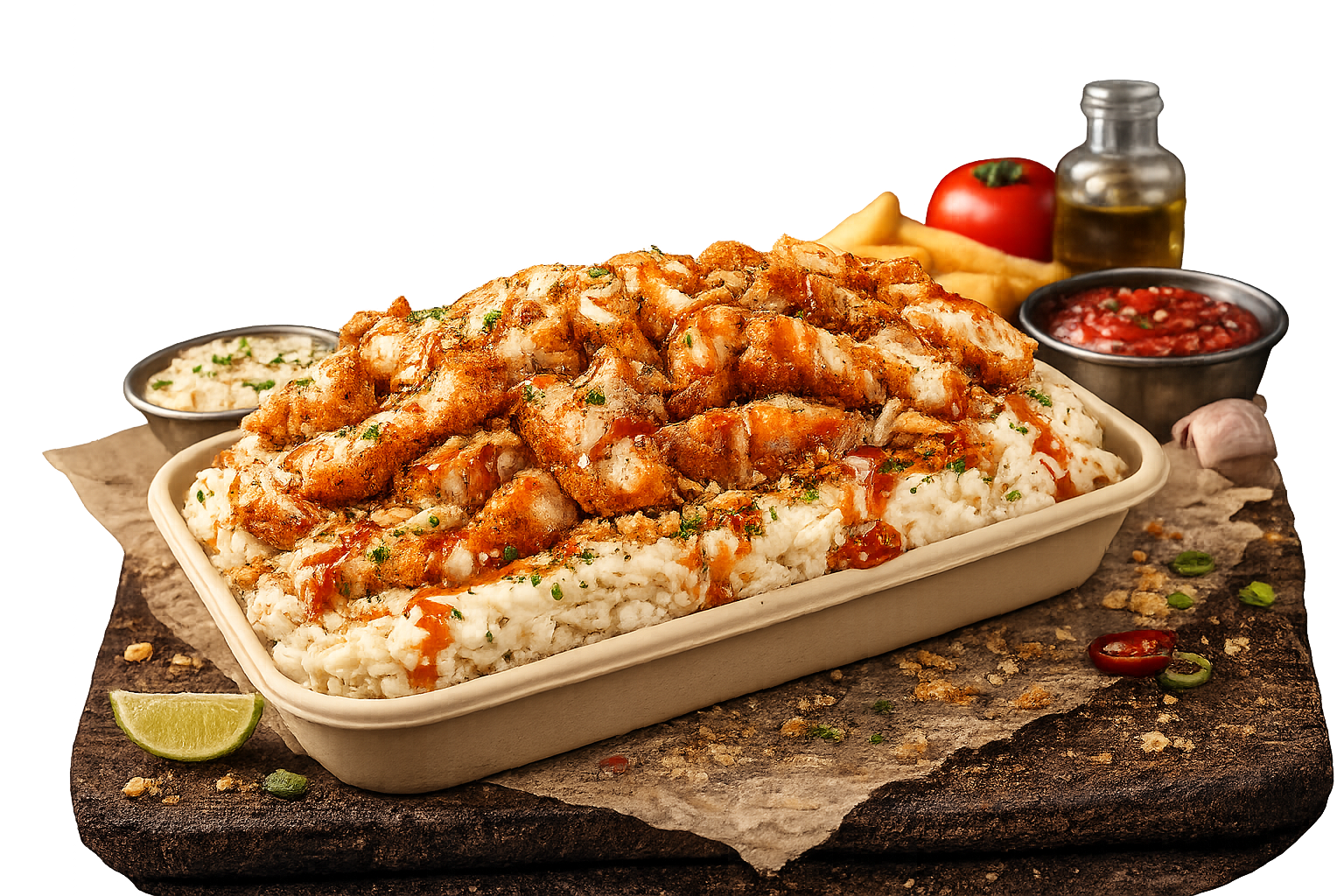 Un mélange généreux de riz, tenders croustillants et sauces savoureuses pour un plat riche en saveurs.