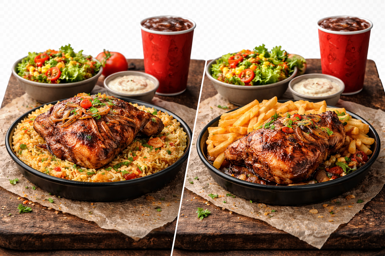 - frites ou riz + Poulet braisé — 9€Un poulet braisé juteux
